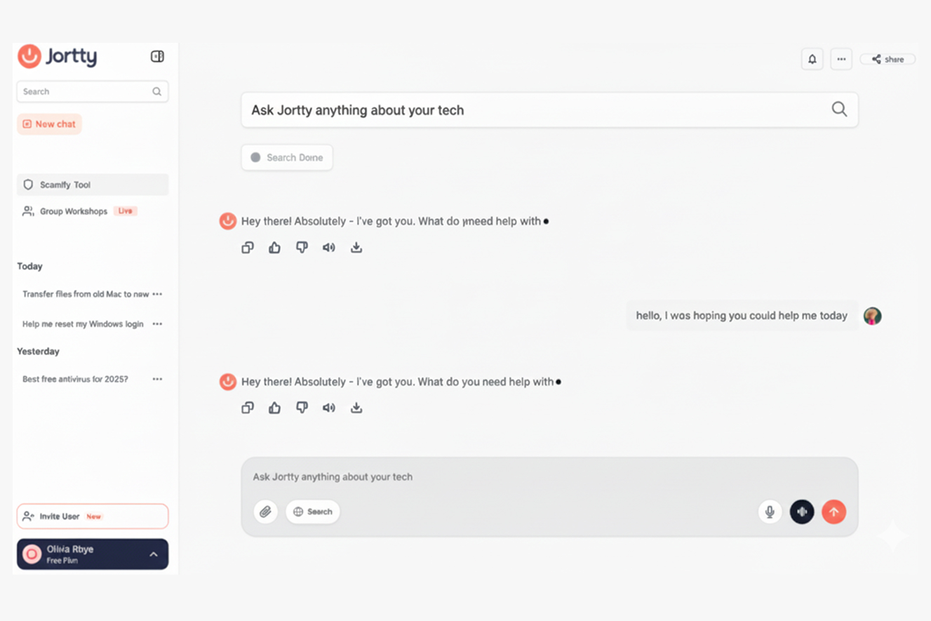 Hi, I’m Jortty, your AI-powered tech companion built to make technology feel less confusing and more approachable. I can help you spot email scams, set up new devices, and handle everyday tech questions with clarity and confidence. You can come to me to check to see what’s safe, fix what’s not working, and move forward without stress because I believe that tech should feel simple, secure, and human-like at every step.
